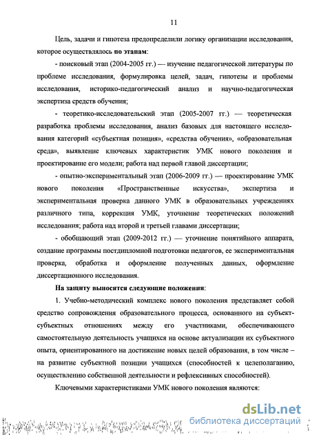 - теоретико-исследовательский этап (2005-2007 гг.) — теоретическая разработка проблемы исследования, анализ базовых для настоящего исследования категорий «субъектная позиция», «средства обучения», «образовательная среда», выявление ключевых характеристик УМК нового поколения и проектирование его модели; работа над первой главой диссертации;