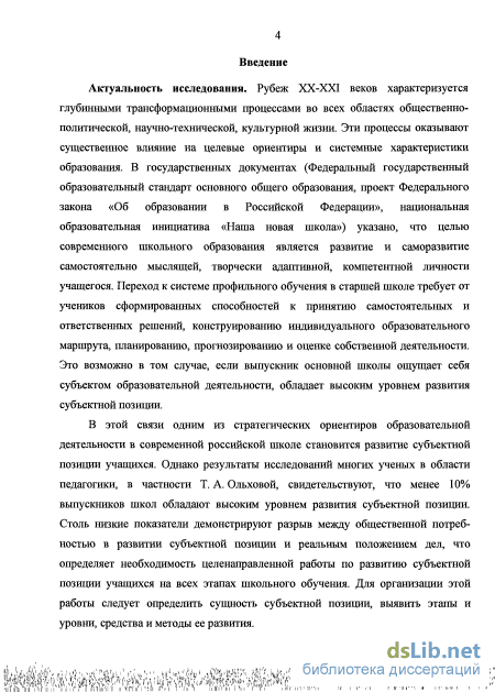 Актуальность исследования. Рубеж ХХ-XXI веков характеризуется глубинными трансформационными процессами во всех областях общественно-политической, научно-технической, культурной жизни. Эти процессы оказывают существенное влияние на целевые ориентиры и системные характеристики образования. В государственных документах (Федеральный государственный образовательный стандарт основного общего образования, проект Федерального закона «Об образовании в Российской Федерации», национальная образовательная инициатива «Наша новая школа») указано, что целью современного школьного образования является развитие и саморазвитие самостоятельно мыслящей, творчески адаптивной, компетентной личности учащегося. Переход к системе профильного обучения в старшей школе требует от учеников сформированных способностей к принятию самостоятельных и ответственных решений, конструированию индивидуального образовательного маршрута, планированию, прогнозированию и оценке собственной деятельности. Это возможно в том случае, если выпускник основной школы ощущает себя субъектом образовательной деятельности, обладает высоким уровнем развития субъектной позиции.
