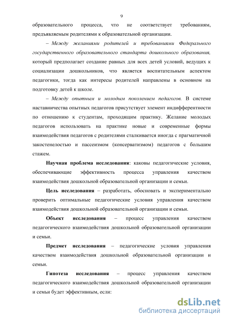 Цель исследования - разработать, обосновать и экспериментально проверить оптимальные педагогические условия управления качеством взаимодействия дошкольной образовательной организации и семьи.