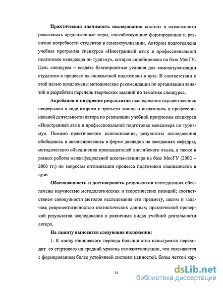 Практическая значимость исследования состоит в возможности реализовать предложенные меры, способствующие формированию и развитию потребности студентов в самоактуализации. Автором подготовлена учебная программа спецкурса «Иностранный язык в профессиональной подготовке менеджера по туризму», которая апробирована на базе МосГУ. Цель спецкурса - создать благоприятные условия для самоактуализации студентов в процессе их иноязычной подготовки в вузе. В соответствии с этой целью предложены методические рекомендации по организации занятий и разработан перечень творческих заданий по тематике спецкурса.