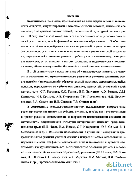 В современных психолого-педагогических исследованиях профессионал рассматривается как целостный субъект, активный, свободный и ответственный в проектировании, осуществлении и творческом преобразовании собственной деятельности, удерживающий культурно-исторический контекст профессионального труда (Е.И. Исаев, Н.А. Исаева, С.Г. Косарецкий, Ю.В. Сенько, В.И. Слободчиков и др.). Изменение представлений о сущности и содержании профессионального развития учителей связано с направленностью исследований на изучение и анализ профессионального сознания и самосознания субъекта деятельности как фундаментального, онтологического основания развития человека - его ценностей, смысловых образований, рефлексии (Е.И. Исаев, Е.А. Климов, В.Е. Клочко, С.Г. Косарецкий, А.К. Маркова, Л.М. Митина, В.И. Слободчиков и др.), профессионального мышления учителя в его взаимосвязи с про-