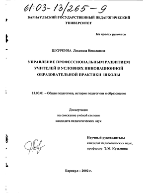 Апробация и внедрение результатов исследования. Результаты исследования нашли отражение в 10 публикациях; в разработке и защите проекта опытно-экспериментальной работы по теме «Управление профессиональным развитием учителей в условиях инновационной образовательной практики» на конкурсе культурно-образовательных инициатив на статус «Федеральная экс-