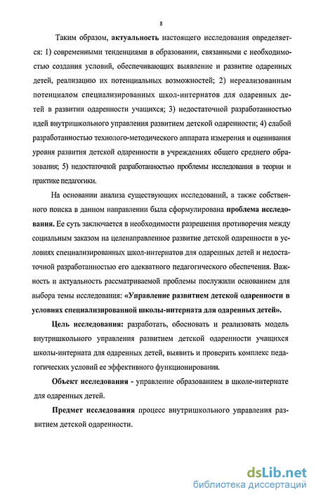 Таким образом, актуальность настоящего исследования определяется: 1) современными тенденциями в образовании, связанными с необходимостью создания условий, обеспечивающих выявление и развитие одаренных детей, реализацию их потенциальных возможностей; 2) нереализованным потенциалом специализированных школ-интернатов для одаренных детей в развитии одаренности учащихся; 3) недостаточной разработанностью идей внутришкольного управления развитием детской одаренности; 4) слабой разработанностью технолого-методического аппарата измерения и оценивания уровня развития детской одаренности в учреждениях общего среднего образования; 5) недостаточной разработанностью проблемы исследования в теории и практике педагогики.