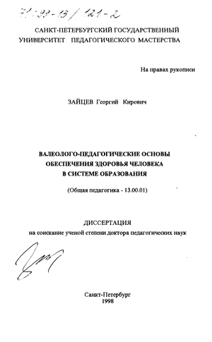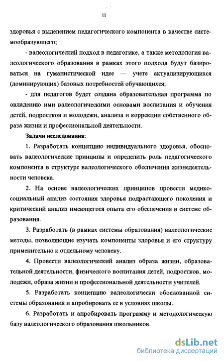 Цель исследования — научно-практическая разработка валеоло-го-педагогических основ обеспечения здоровья человека в системе образования.