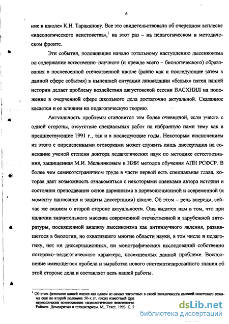 Актуальность проблемы становится тем более очевидной, если учесть с одной стороны, отсутствие специальных работ на избранную нами тему как в предшествующие 1991 г., так и в последующие годы. Некоторым исключением из этого с определенными оговорками может служить лишь диссертация на соискание ученой степени доктора педагогических наук по методике естествознаний, защищенная М.И. Мельниковым в НИИ методов обучения АПН РСФСР. В более чем семисотстраничном труде в части первой есть специальная глава, которая дает возможность ознакомиться с некоторыми оценками автора истории и состояния преподавания основ дарвинизма в дореволюционной и современной (к моменту написания и защиты диссертации) школе. Об этом - речь впереди, сейчас же скажем о второй стороне актуальности. Она видится нам в том, что при наличии значительного массива современной отечественной и зарубежной литературы, посвященной анализу лысенкоизма как антинаучного явления, развившегося в биологии, но охватившего многие области науки, в том числе и педагогику, нет ни диссертационных, ни монографических исследований собственно историке—педагогического характера, посвященных данной проблеме. Восполнение имеющегося пробела и выработка нового систематизированного знания об этой стороне дела и составляет цель нашей работы.