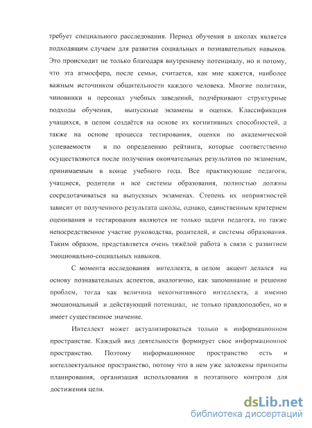 - на первом этапе – поисково-теоретическом (2003-2006гг.) – изучалось состояние проблемы диссертационного исследования; анализировались теоретические и методические работы по проблеме исследования; определялись исходные положения, имеющие принципиальное значение для исследования, выявлялись особенности деятельности образовательных учреждений, выделялись факторы, влияющие на формирование познавательного и эмоционального интеллекта учащихся, разрабатывалась программа опытно-педагогической работы;
