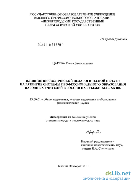 Эта проблема определила тему диссертационного исследования: «Влияние периодической педагогической печати на развитие системы профессионального образования народных учителей в России на рубеже XIX'- XXвв.».