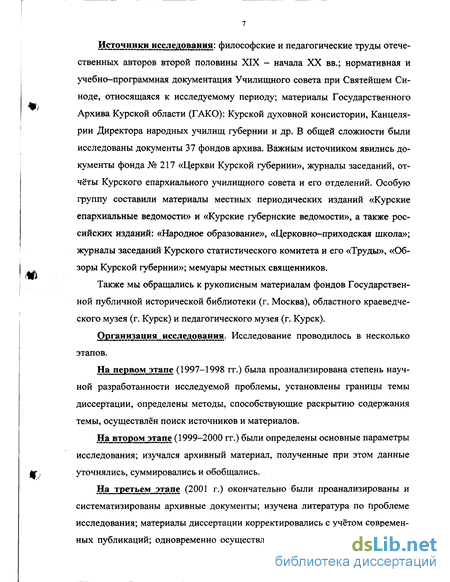 Источники исследования: философские и педагогические труды отечественных авторов второй половины XIX - начала XX вв.; нормативная и учебно-программная документация Училищного совета при Святейшем Синоде, относящаяся к исследуемому периоду; материалы Государственного Архива Курской области (ГАКО): Курской духовной консистории, Канцелярии Директора народных училищ губернии и др. В общей сложности были исследованы документы 37 фондов архива. Важным источником явились документы фонда № 217 «Церкви Курской губернии», журналы заседаний, отчёты Курского епархиального училищного совета и его отделений. Особую группу составили материалы местных периодических изданий «Курские епархиальные ведомости» и «Курские губернские ведомости», а также российских изданий: «Народное образование», «Церковно-приходская школа»; журналы заседаний Курского статистического комитета и его «Труды», «Обзоры Курской губернии»; мемуары местных священников.