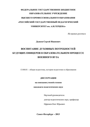 Актуальность, теоретическая и практическая значимость, недостаточная разработанность в педагогике сформулированной научной задачи определили выбор темы диссертации: «Воспитание духовных потребностей будущих офицеров в образовательном процессе военного вуза».