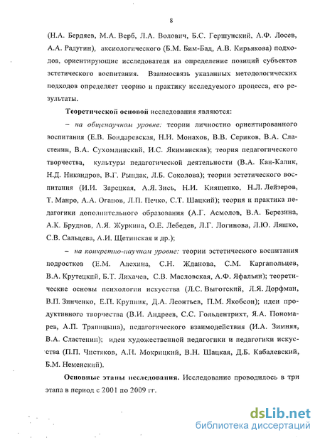 на конкретно-научном уровне: теории эстетического воспитания подростков (Е.М. Алехина, С.Н. Жданова, С.М. Каргапольцев, В.А. Крутецкий, Б.Т. Лихачев, С.В. Масловская, А.Ф. Яфальян); теоретические основы психологии искусства (Л.С. Выготский, Л.Я. Дорфман, В.П. Зинченко, Е.П. Крупник, Д.А. Леонтьев, П.М. Якобсон); идеи продуктивного творчества (В.И. Андреев, С.С. Гольдентрихт, Я.А. Пономарев, А.П. Тряпицына), педагогического взаимодействия (И.А. Зимняя, В.А. Сластенин); идеи художественной педагогики и педагогики искусства (П.П. Чистяков, А.Н. Мокрицкий, В.Н. Шацкая, Д.Б. Кабалевский, Б.М. Неменский).