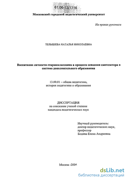 Предмет исследования - воспитание личности старшеклассника в процессе освоения синтезатора в системе дополнительного образования.