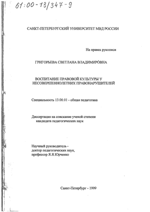 Воспитание правовой культуры у такой специфической категории, как несовершеннолетние правонарушители, представляет собой сложный психолого-педагогический процесс перевода объективных требований права и морали в личные убеждения несовершеннолетнего правонарушителя и на этой основе развития у него способности к саморегуляции своих действий и поступков. Несовершеннолетний правонарушитель должен научиться задумываться над своими поступками, оценивать их, сдерживать в необходимых случаях свои порывы с отрицательной направленностью, противостоять негативным влияниям, проводить различия между шалостями и противоправным поведением.