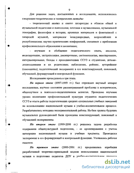 Для решения задач, поставленных в исследовании, использовались следующие теоретические и эмпирические методы: - теоретический анализ и синтез литературы в области общей и музыкальной педагогики и психологии; эстетики и музыкознания, музыкальной этнографии, философии и истории, архивных материалов и фонозаписей с татарской музыкой, материалов" международных, всероссийских и республиканских научно-практических конференций, связанных с проблемами профессионального образования и воспитания; изучение и обобщение педагогического опыта, аналогия, моделирование, экстраполяция, ранжирование, систематизация, анкетирование, интервьюирование, беседы с преподавателями ССУЗ и студентами, детьми-дошкольниками и их родителями; наблюдение, рейтинг, ауторейнинг (самооценка), педагогический эксперимент в его констатирующей, поисковой, обучающей, формирующей и контрольной функциях.