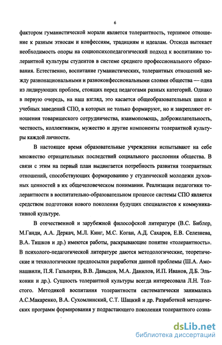 В отечественной и зарубежной философской литературе (B.C. Библер, М.Ганди, А.А. Деркач, М.Л. Кинг, М.С. Коган, А.Д. Сахаров, Е.В. Селезнева, В.А. Тишков и др.) имеются работы, раскрывающие понятие «толерантность». В психолого-педагогической литературе даются методологические, теоретические и технологические предпосылки разработки данной проблемы (Ш.А. Амо-нашвили, П.Я. Гальперин, В.В. Давыдов, М.А. Данилов, И.П. Иванов, Д.Б. Эль-конин и др.). Сущность толерантной культуры всегда интересовала Л.Н. Толстого. Методикой воспитания толерантности систематически занимались А.С.Макаренко, В.А. Сухомлинский, СТ. Шацкий и др. Разработкой методических программ формирования у подрастающего поколения толерантного созна-