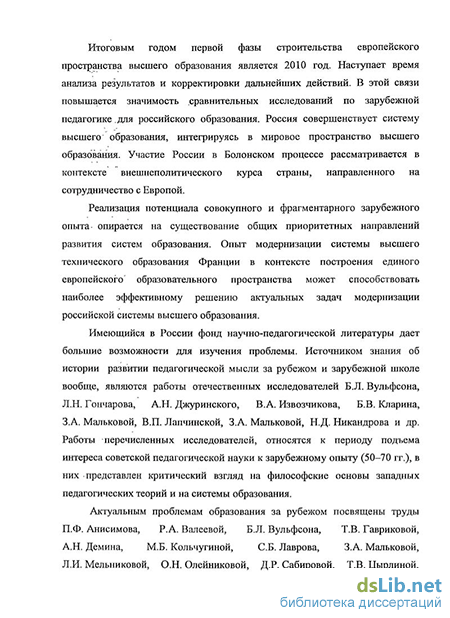 Современные российские диссертационные исследования в области педагогики касаются различных проблем развития и реформирования систем образования в странах Евросоюза (О.Н. Олейникова, Е.А. Торопов, А.Н. Кирилловский, М.Р. Лисенко, Е.А. Мишина, А.Н. Кельмурзина). В научных работах исследуется содержание и технологии подготовки менеджеров в высших профессиональных школах Франции (Т.А. Плюшкина), раскрываются вопросы непрерывного образования взрослых (Е.В. Онушкина), аспекты подготовки инженеров сельскохозяйственного профиля (О.Д. Гущина), вопросы организации, контроля и оценки студентов в университетах России и Франции (Л.Г. Мартыненко).