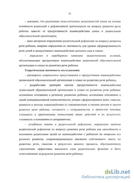 – доказано, что реализация педагогических возможностей семьи на основе готовности родителей к рефлексивной деятельности по вопросу развития речи ребенка зависит от продуктивности взаимодействия семьи и дошкольной образовательной организации;