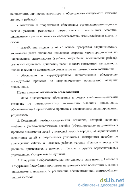 Научная новизна исследования состоит в том, что: 1. Выявлены, обоснованы и экспериментально проверены организационно-педагогические условия патриотического воспитания младших школьников в образовательной деятельности, основными из которых являются: психолого-педагогические условия (обеспечение единства педагогического процесса патриотического воспитания с учетом особенностей субъектов деятельности), дидактические условия (реализация процесса взаимодействия школы и семьи в патриотическом воспитании младших школьников в учебной, внеучебной, внешкольной деятельности); организационные условия (организация взаимодействия субъектов образовательной деятельности по патриотическому воспитанию: учителей, школьников и их родителей через включение в социально значимые виды деятельности; посред-