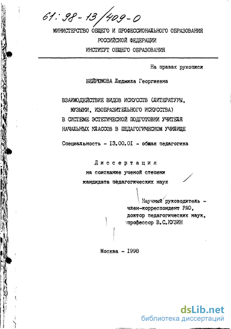 Все сказанное определяет актуальность и выбор темы данного исследования - "Взаимодействие видов искусств (литературы, музыки, изобразительного искусства) в системе эстетической подготовки учителя начальных классов в педагогическом училище", посвященного восполнению указанного пробела в педагогической науке*