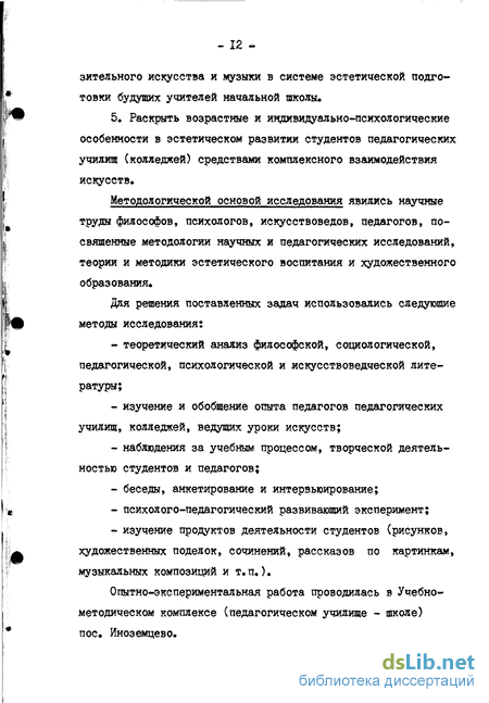 студентов педагогических училищ (колледжей) средствами искусств; раскрытия психолого-педагогических основ эстетического воспитания студентов педагогических училищ средствами искусств; педагогического обоснования содержания экспериментальной программы взаимодействия видов искусств (литературы, музыки, изобразительного искусства) в системе эстетической подготовки будущих учителей начальной школы; раскрытия возрастных и индивидуально-психологических особенностей в эстетическом развитии студентов педагогических училищ средствами комплексного взаимодействия искусств; разработки методических рекомендаций по эстетическому воспитанию и развитию студентов в процессе обучения курсам предметов искусств,