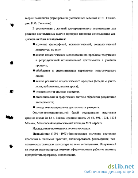 В соответствии с логикой диссертационного исследования для решения поставленных задач и проверки гипотезы использованы следующие методы исследования: изучение философской, психологической, социологической литературы по теме; анализ педагогических исследований по проблеме творческой и репродуктивной познавательной деятельности в учебном процессе; обобщение и систематизация передового педагогического опыта; анализ реального педагогического процесса (беседы с учителями, наблюдение, анализ урока), эксперимент и опытная проверки, статистический и графический методы обработки результатов эксперимента; метод анализа продуктов деятельности учащихся. Опытно-экспериментальной базой исследования выступали средняя школа № 12 г. Бийска, средние школы № 56, 591, 1231, 1234 Москвы, Московский педагогический колледж № 9 «Арбат».