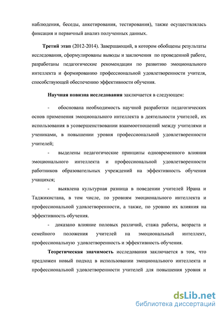 Степень разработанности. В последние годы активизировались исследовательские работы, посвященные проблемам эмоционального интеллекта, профессиональной удовлетворенности и эффективности обучения. Исследуемые проблемы рассматривались западными учёными Бар-он Р., Гоулман Д., Шерман, Майер Дж, Селовей П., Дженсен Е., Макдрури Дж., Томас Л., Вонг С. и др.; иранскими учеными:АхмадиИбодуллох, ИрониёнСаидджавад, ПорсонеджадМаъсуме, АбулькасемиШахнам, Ахади Б., Наримани М., Абулкасими А., Асияи М., АзкиёМустафо, Таваккали Махмуд, Бани Хашемиян К., Бахрами Х., Муэдзин М., Гулпарвар М., Хоксор Ф., Дехшири Г., Джамали Ахтар, Такипур Захир Али, Салехи Муслим Малики Оворсин Садек, Сайид Келан Мирмухаммад, Мирмухаммаде Мейбади Сайед Джалил, Мазлуми Мухаммадабади Сайид Саъид, Шарифпур Захро, Шахбази Хасан и др. Среди российских ученых и исследователей по проблемам эмоционального интеллекта работали Андреева И. Н., Д.В. Люсин, Э.Л. Носенко, Н.В. Коврига, О.И. Власова, Г.В. Юсупова, М.А. Манойлова, Т.П. Березовская, А.П. Лобанов,А.С. Петровская и другие,которые работают над проблемой в рамкахотечественной психологии и педагогики.