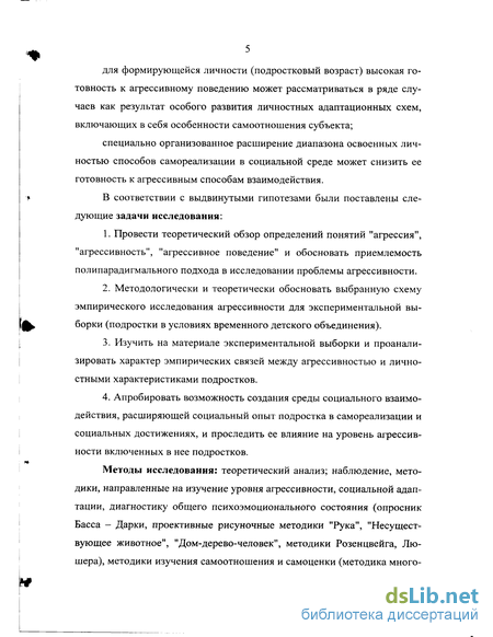 Методы исследования: теоретический анализ; наблюдение, методики, направленные на изучение уровня агрессивности, социальной адаптации, диагностику общего психоэмоционального состояния (опросник Басса - Дарки, проективные рисуночные методики "Рука", "Несуществующее животное", "Дом-дерево-человек", методики Розенцвейга, Лю-шера), методики изучения самоотношения и самоценки (методика много-