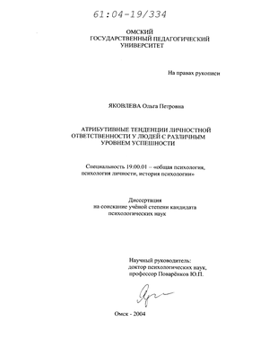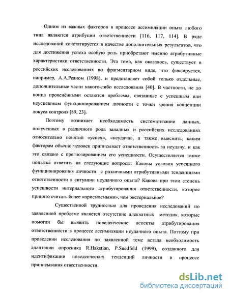 Одним из важных факторов в процессе ассимиляции опыта любого типа являются атрибуции ответственности [116, 117, 114]. В ряде исследований констатируется в качестве дополнительных результатов, что для достижения успеха особую роль приобретают именно атрибутивные характеристики ответственности. Эта тема, как оказалось, существует в российских исследованиях во фрагментарном виде, что фиксируется, например, А.А.Реаном (1998), и представляет собой только отдельные, дополнительные части какого-либо исследования [40]. В частности, не до конца прояснёнными остаются проблемы, связанные с успешным или неуспешным функционированием личности с точки зрения концепции локуса контроля [89, 23].