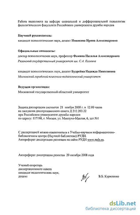 Апробации и внедрение результатов исследования. Основные результаты и положения исследования обсуждались на заседаниях кафедры социальной и дифференциальной психологии филологического факультета Российского университета дружбы народов и на следующих научных конференциях: Межвузовских психологических чтениях студентов, аспирантов и молодых ученых (Москва, РУДИ, 2003-2005 гг., 2008 г.); Международной научно-практической конференции «Индивидуальные различия и проблема индивидуальности» (Москва, октябрь 2003 г.). Международной научно-практической конференции «Высшая школа: опыт, проблемы, перспективы» (Москва, РУДИ, июнь 2008 г.).