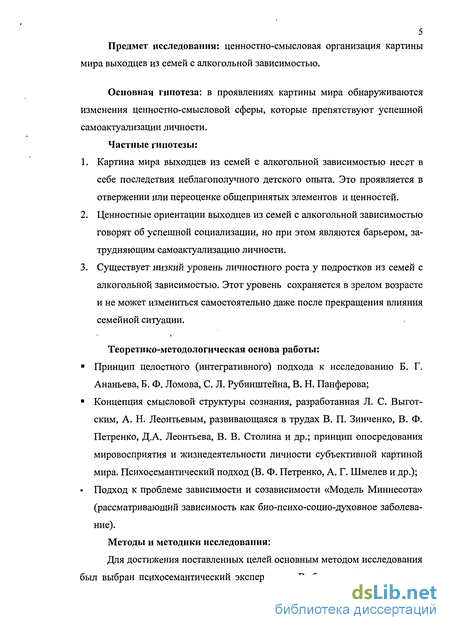 Предмет исследования: ценностно-смысловая организация картины мира выходцев из семей с проблемой алкогольной зависимости.