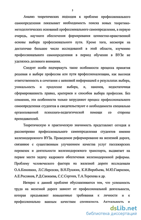 Теоретическую и практическую значимость представляет сегодня и рассмотрение профессионального самоопределения студентов именно железнодорожного ВУЗа. Проводимое реформирование на железной дороге, связанное с существенным улучшением качества услуг пассажирских перевозок и деятельности железнодорожного транспорта, выдвигает на первое место задачу кадрового обеспечения железнодорожной реформы. Проблему человеческого фактора на железной дороге исследовали О.А.Конопкин, Л.С.Нерсесян, В.Н.Пушкин, К.И.Воробьева, М.Ю.Гаврилюк, А.Е.Росляков, Р.Д.Санжаева, С.С.Сергеев, Т.А.Терехова и др.