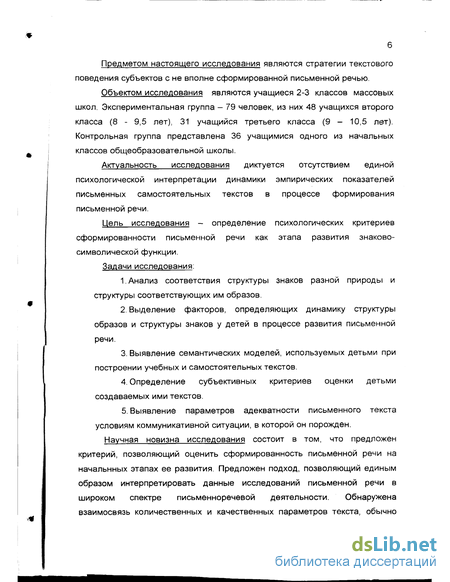 Указанные особенности переносят основной акцент проблемы формирования письменной речи с рассмотрения письма как механизма письменной речи на исследование письменноречевой деятельности, в особенности - на изучение того психологического содержания, которое выражается порождаемым текстом. Данный аспект письменной речи изучен недостаточно, хотя в последнее время появились работы, направленные на исследование формирования семантической структуры письменных текстов [44, 97, 107]. Эти работы вернули проблему формирования письменной речи в разряд психологических проблем прежде всего за счет того, что в них письменная речь рассматривается вне жесткой связи с программным школьным обучением. Тем не менее, открытым остается вопрос о том, что является психологическим критерием сформированности письменной речи и какова психологическая интерпретация динамики показателей, традиционно используемых качестве основных параметров ее оценки.
