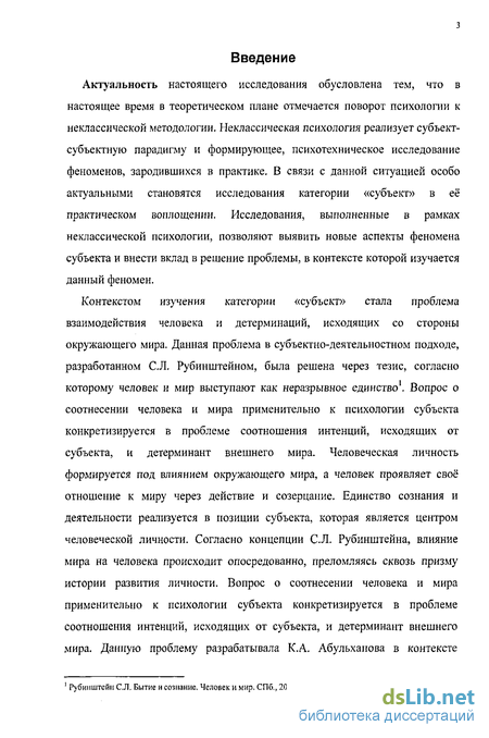 Контекстом изучения категории «субъект» стала проблема взаимодействия человека и детерминаций, исходящих со стороны окружающего мира. Данная проблема в субъектно-деятелыюстном подходе, разработанном C.R. Рубинштейном, была решена через тезис, согласно которому человек и мир выступают как неразрывное единство1. Вопрос о соотнесении человека и мира применительно к психологии субъекта конкретизируется в проблеме соотношения интенций, исходящих от субъекта, и детерминант внешнего мира. Человеческая личность формируется под влиянием окружающего мира, а человек проявляет своё отношение к миру через действие и созерцание. Единство сознания и деятельности реализуется в позиции субъекта, которая является центром человеческой личности. Согласно концепции С.Л. Рубинштейна, влияние мира на человека происходит опосредованно, преломляясь сквозь призму истории развития личности. Вопрос о соотнесении человека и мира применительно к психологии субъекта конкретизируется в проблеме соотношения интенций, исходящих от субъекта, и детерминант внешнего мира. Данную проблему разрабатывала К.А. Абульханова в контексте