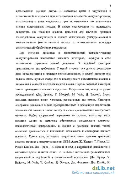 Для изучения динамики и закономерностей психологического консультирования необходимо выделить категорию, несущую в себе возможность отражения данной динамики. К подобной категории предъявляются два требования. С одной стороны она должна достаточно явно прослеживаться в процессе консультирования, с другой стороны она должна иметь научный статус для её последующего объективного анализа и включения в контекст психологического знания. На роль подобной категории может претендовать понятие «нарратив». Нарративом мы, вслед за рядом исследователей (Дж. Брунер, Г. Мюррей, М. Уайт, Д. Эпстон), будем называть историю жизни человека, рассказанную им самим. Категория «нарратив» заключает в себе пространственную и временную целостность человеческой жизни, а также логику и смысл существования конкретного человека. Выбор нарративной парадигмы не случаен, поскольку текст является одним из немногих объективных свидетельств динамики психологической консультации, и именно с помощью анализа текста возможно приблизиться к пониманию механизмов и специфики данного процесса. Кроме того, категория «нарратив» имеет давнюю традицию анализа, начиная с литературоведения (Ж.М. Адам, Ж. Женетт, Т. Павел, Ш. Римон-Кеннан, Дж. Принс , В. Шмидт и др.), а нарративная психология в настоящее время является одним из наиболее интенсивно развивающихся направлений в зарубежной и отечественной психологии (Дж. Бунер, У. Найссер, М. Уайт, Т. Сарбин, Д. Эпстон, Дж. Фридман, Дж. Комбс, К.