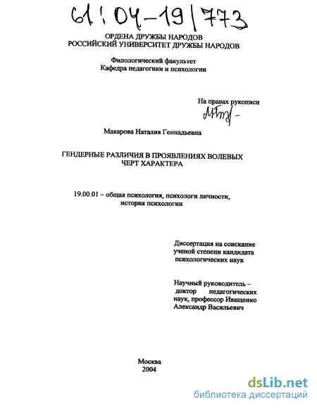 4) Представленный в диссертации материал по тендерным различиям в проявлениях волевых черт личности - настойчивости, рискованности, самоконтроля открывает возможность прогнозирования развития дальнейшего исследования в данном направлении.