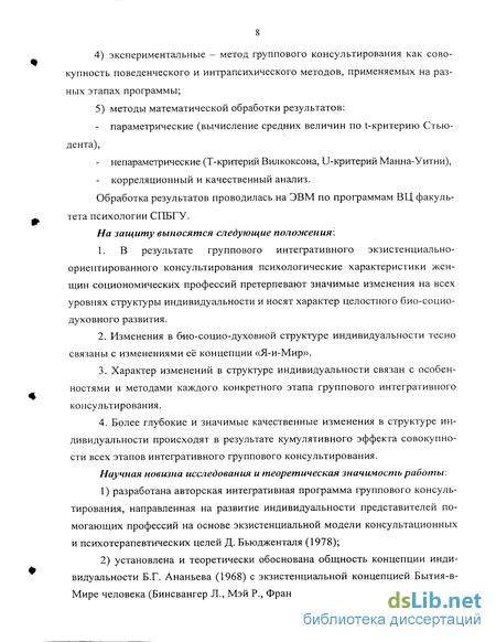 Таким образом, представляется актуальным изучение изменения индивидуальности взрослого человека на примере женщин вышеназванных профессий под влиянием интегративной экзистенциально-ориентированной программы группового консультирования, что позволяет выявить некоторые закономерности этого развития и сформировать научно обоснованные методы организации эффективной психологической помощи специалистам соционо-мических профессий.