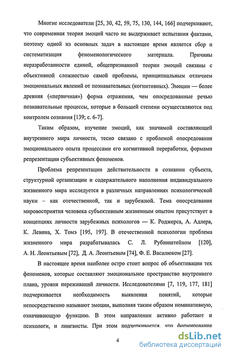 Восприятие своего эмоционального опыта, отражение его в знаках — номинативах эмоций и чувств является частью процесса создания целостной картины многообразного и структурированного внутреннего мира. Однако современные исследования в данной области представлены работами психологов и лингвистов, которые, ссылаясь на неразработанность данной тематики, остаются в рамках рассмотрения частных вопросов. В результате исследования психологов нередко ограничиваются изучением количества «базовых» эмоций [53], либо выделением двух-трех измерений, призванных описать все многообразие эмоций и чувств без их детализации и дифференциации [42], а материалы лингвистических исследований содержат в разделах «Эмоции, чувства, состояния» понятия, описывающие другие сферы психического [121]. Представляется, что объединение данных подходов позволит преодолеть существующие недостатки лингвистического и психологического походов к изучению эмоций и восстановить целостный процесс восприятия, отображения и репрезентации в знаковых формах эмоционального опыта личности.