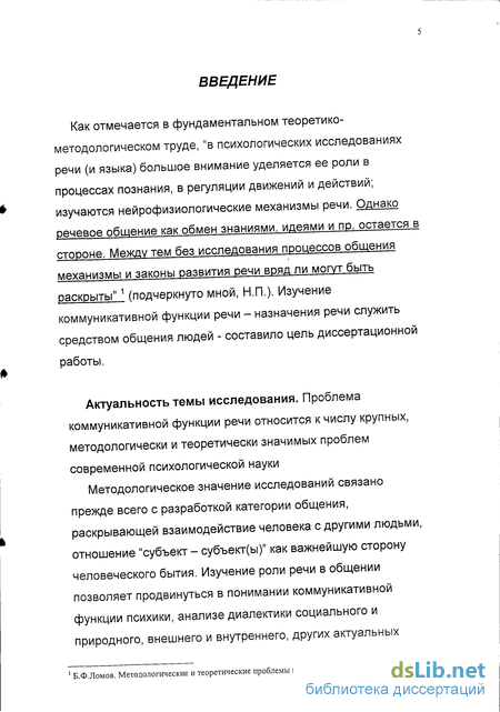 Как отмечается в фундаментальном теоретико-методологическом труде, "в психологических исследованиях речи (и языка) большое внимание уделяется ее роли в процессах познания, в регуляции движений и действий; изучаются нейрофизиологические механизмы речи. Однако речевое общение как обмен знаниями, идеями и пр. остается в стороне. Между тем без исследования процессов общения механизмы и законы развития речи вряд ли могут быть раскрыты"1 (подчеркнуто мной, Н.П.). Изучение коммуникативной функции речи - назначения речи служить средством общения людей - составило цель диссертационной работы.