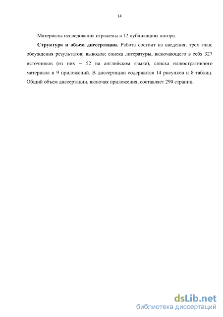 Структура и объем диссертации. Работа состоит из введения; трех глав; обсуждения результатов; выводов; списка литературы, включающего в себя 327 источников (из них - 52 на английском языке), списка иллюстративного материала и 9 приложений. В диссертации содержится 14 рисунков и 8 таблиц. Общий объем диссертации, включая приложения, составляет 290 страниц.