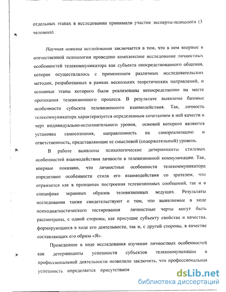 Научная новизна исследования заключается в том, что в нем впервые в отечественной психологии проведено комплексное исследование личностных особенностей телекоммуникатора как субъекта опосредствованного общения, которое осуществлялось с применением различных исследовательских методик, разработанных в рамках нескольких теоретических направлений, и основные этапы которого были реализованы непосредственно на месте протекания телевизионного процесса. В результате выявлены базовые особенности субъекта телевизионного взаимодействия. Так, личность телекоммуникатора характеризуется определенным сочетанием в ней качеств и черт индивидуально-исполнительного уровня, основой которого являются установка самосознания, направленность на самореализацию и ответственность, представляющие ее смысловой (содержательный) уровень.