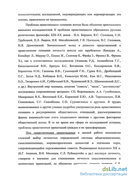 Проблема нравственного сознания всегда была объектом пристального внимания исследователей. К проблеме нравственности обращались русские религиозные философы XIX-XX веков - Н.А. Бердяев, B.C. Соловьев, С.Н. Трубецкой, П.Л. Лавров, Н.К. Михайловский, Г.В. Плеханов, B.C. Соловьев, Н.Я. Данилевский. Значительный вклад в развитие представлений о нравственном сознании личности внесли как зарубежные (Бандура А., Кольберг Л., Маурер О., Пиаже Ж., Скиннер Б., Фрейд 3., Франкл В., Фромм Э.), так и отечественные исследователи (Азимова Р.Д., Акмамбетов Г.Г., Бакштановский В.И., Братусь Б.С, Богданова О.С., Бондаревская Е.В., Бормотова И.М., Гасанова Н.К., Гумницкий Г.Н., Гурин В.Е., Дробницкий О.Г., Зотов Н.Д., Кобляков В.П., Ковальчук Ю.М., Кон И.С., Николаичев Б.О., Титаренко А.И., Субботский Е.В., Чудновский В.Э., Шимановский Д.С., и др.). Внутренний мир человека, понятия "совесть", "честь", "достоинство" исследованы современными авторами: СП. Воронцовым, А.А. Гусейновым, Манеровым В.Х., Веселовой Е.К., Коржовой Е.Ю., А.В. Терешкиным, П.В. Симоновым, С.Г. Спасибенко, СП. Суровягиным и другими. В трудах вышеназванных и других ученых подробно раскрывается роль нравственного сознания- в регулировании общественных отношений, рассматриваются формы взаимодействия этого социального явления с другими факторами общественной жизни. В то же время вне сферы их исследований остались проблемы нравственных ориентации граждан и их трансформации.