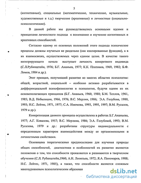 Основными теоретическими предпосылками для изучения природы общих способностей, диагностики и особенностей их развития являются положения о том, что способности проявляются и развиваются в творческом обучении (С.Л. Рубинштейн, 1960; А.Н. Леонтьев, 1972; Я.А. Пономарев, 1988; Н.С. Лейтес, 1971, 1985), а также, что способности являются сложным многоуровневым психологическим образованием, включающим в себя многие