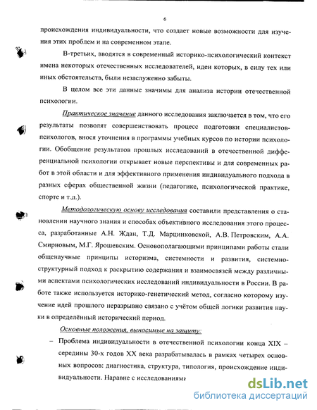 Существует круг историко-психологических исследований, направленных на анализ творчества и идей отдельных отечественных психологов конца XIX - первой трети XX века, занимавшихся вопросами индивидуальной психологии, а именно: диссертации П.И. Садчиковой [298], В.А. Смирнова [319] посвящены изучению психологических идей А.Ф. Лазурского, Д.С. Тимофеева -научному творчеству И.А. Сикорского [346], Э.Г. Исаевой - научным воззрениям М.Я. Басова [135], В.В. Аншаковой - вопросам психологии в трудах А.П. Нечаева [5] и другие исследования. Все эти исследования представляют собой как бы отдельные фрагменты мозаичной картины, не дающие возможность увидеть целостное полотно, создать полное представление об особенностях становления отечественной дифференциальной психологии и формирования круга ее проблем.