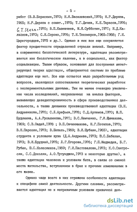 работ (В.В.Борискин,1973; Н.Н.Василевский,1975; Н.Р.Деряпа, 1965; Н.Р.Деряпа с соавт.,1975; Т.Г.Дичев, К.Е.Тарасов,1976; Q Т 5гм>197; В.П.Казначеев, М.Я.Субботин,1971; И.Д.Ка-лайков,1973; С.И.Сороко,1976; Т.И.Тихомиров,1965-1968; Г.И. Царегородцев,1975 и др.). Однако в них все еще сохраняется фактор предметности определенной отрасли знаний. Например, в современной биологической литературе, адаптации рассматривается как биологическое явление, а в социальной, как фактор социализации. Таким образом, основания для построения интегрирующей теории адаптации, общепринятой системы по проблеме адаптации еще нет. Все еще остается мало разработанным ряд вопросов, касающихся сопоставления теоретических разработок с экспериментальными данными. Тем не менее очевидно увеличение числа исследований, направленных на анализ факторов, вызывающих дезадаптированность в сфере производственной деятельности, а также динамики производственной адаптации (В.Н. Андреенкова,1970; С.Л.Арефьев,1978; С.Д.Артемов,1970; М.П. Будякина, А.А.Русалинова,1971; В.С.Немченко, Г.И.Щинакова, 1969; С.В.0вдей,1978 ; Э.П.Овчинникова, Н.Г.Потапов,1970; В.Н.Парохин,1973; В.Шепель,1969; В.И.Шубкин,1965), адаптации студента к условиям вуза (Д.А.Андреева,1973; Ю.С.Бабахан, 1973; В.И.Брудний,1975; Л.Г.Егорова,1976; Г.П.Медведев, Б.Г. І^убин, Ю.С.Колесников, 1969; Г.И.Пастовалова,1973; К.О.Сантро-сян, С.С.Дохолян, А.0.Тутунджян,1973 и некоторые другие), а также адаптации человека к условиям быта, в связи со сменой места жительства, вступлением в брак и прочими изменениями в его жизни.