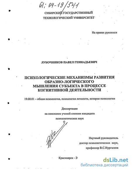 Предмет исследования - психологические механизмы развития образно-логического мышления субъекта в процессе когнитивной деятельности.