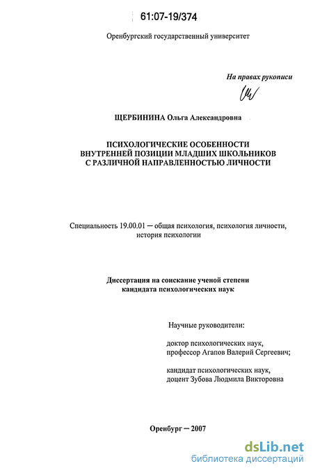 Предмет исследования - психологические особенности внутренней позиции младших школьников с различной направленностью личности.
