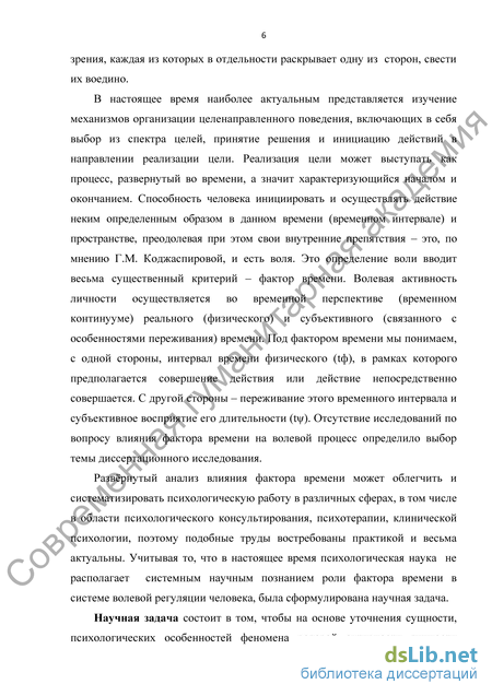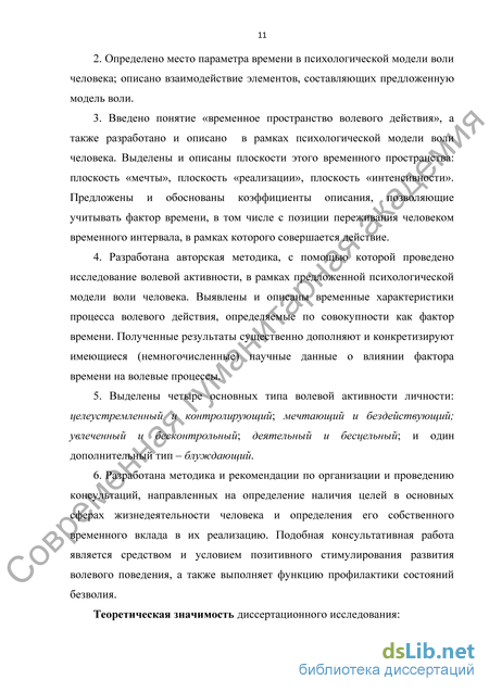 Теоретическая значимость диссертационного исследования: - параметр времени определен как важная составляющая человеческой воли. Введение фактора времени в систему воли и волевого действия позволяет определить новые направления и содержательно конкретизировать концептуальные основы теоретико-экспериментальных исследований воли; - введение временного фактора позволило разработать целостную психологическую модель воли человека, определенную как «Волевая система координат». В данной модели было определено место-роль параметра времени в системе воли человека, проанализировано и описано взаимодействие элементов, составляющих модель воли, намечены пути дальнейшего изучения проблем воли; получила дальнейшее развитие идея факторного пространства переживания времени, предложенная Е.И. Головахой и А.А. Кроником. Разработанное автором «временное пространство волевого действия», в котором названы образующие оси и плоскости этого пространства и введены соответствующие коэффициенты описания, может быть представлено как часть факторного пространства переживания времени; разработанная авторская методика «Замок» методически развивает идеи А.И. Высоцкого о возможности определения некоторых аспектов волевых параметров личности. С помощью двух приборов, условно названных «Загадка», автор «измерял» выраженность настойчивости. В настоящей работе для моделирования и изучения волевого процесса, в качестве аппаратурно-процессуальной основы, предложено использовать кодовый велосипедный замок модели «PD – 83 CODE». Создано методическое обеспечение и инструкции применения методики «Замок». Введены и определены величины коэффициентов, позволяющие учитывать временной фактор, определяемый рядом существенных обстоятельств переживания времени, оказывающих непосредственное влияние на результат волевого процесса: коэффициент мечты (Км), коэффициент реализации (Кр), коэффициент интенсивности (Ки); - в рамках психологической модели воли человека, представленной в виде «волевой системы координат», выделены четыре основных типа волевой активности человека – целеустремленный и контролирующий; мечтающий и бездействующий; увлеченный и бесконтрольный; деятельный и бесцельный; и один дополнительный тип – блуждающий; - впервые разработаны научно-методические основы (методика и рекомендации по организации процесса) проведения специализированной консультативной работы в целях создания эффективных условий и активации развития волевой основы поведения личности и профилактики состояний безволия; - полученные в ходе проведенной теоретико-экспериментальной работы данные о возможности построения и апробации психологической модели воли человека обеспечивают понимание процесса взаимодействия элементов модели в рамках моделируемого волевого процесса. А также доказывают, что временная перспектива (временной континуум) существенно влияет как на проявление волевой активности при преодолении специфического затруднения в случае реализации отдельной задачи, так и на результат в целом. Выделенные в ходе моделирования типы волевой активности личности позволяют говорить о возможности построения волевой типологии, что вносит вклад, дополняет и обогащает не только общую психологию (особенно в разделе «психология воли»), но и такие 