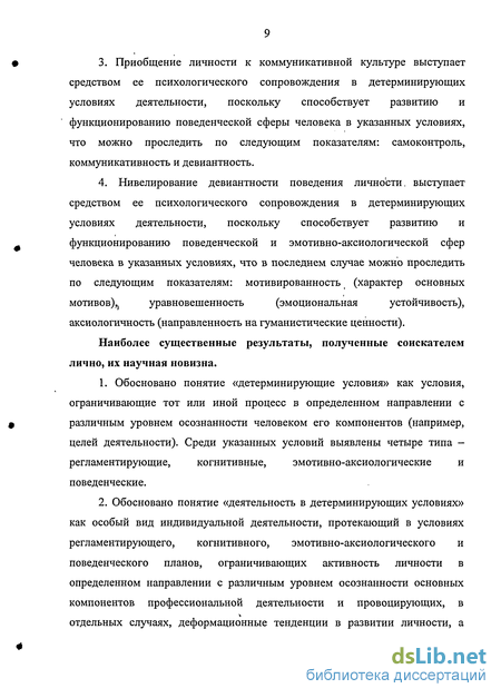 4. Нивелирование девиантности поведения личности, выступает средством ее психологического сопровождения в детерминирующих условиях деятельности, поскольку способствует развитию и функционированию поведенческой и эмотивно-аксиологической сфер человека в указанных условиях, что в последнем случае можно проследить по следующим показателям: мотивированность (характер основных мотивов) уравновешенность (эмоциональная устойчивость), аксиологичность (направленность на гуманистические ценности).