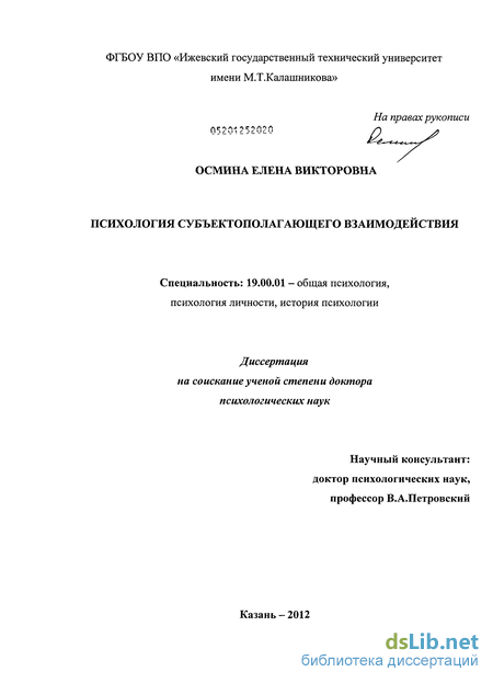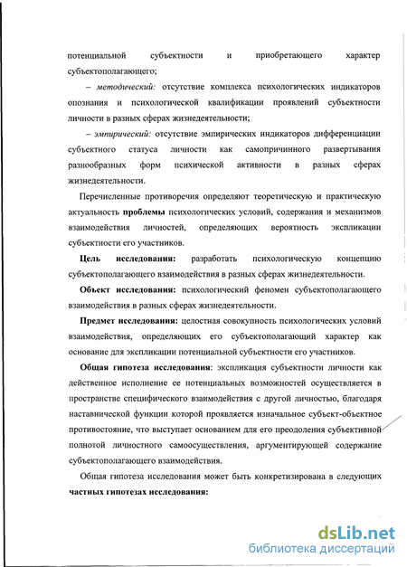 Предмет исследования: целостная совокупность психологических условий субъектополагающего взаимодействия как основания для экспликации потенциальной субъектности его участников.