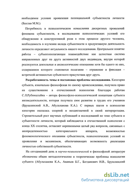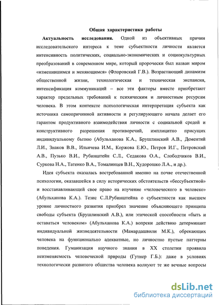Актуальность исследования. Тема субъекта в отечественной психологии получила право на существование благодаря работам С.Л.Рубинштейна, предложившего развернутую философско-психологическую концепцию субъекта жизнедеятельности, получившую свое развитие в трудах его учеников (Брушлинский А.В., Абульханова К.А.). В конце ХХ столетия наблюдается стремительный рост соответствующих публикаций и исследований (Барабанщиков В.А., Богданович Н.В., Богоявленская Д.Б., Волкова Е.Н., Дементий Л.И., Знаков В.В., Ильичева И.М., Коржова Е.Ю., Маркова А.К., Петровский В.А., Селиванов В.В., Сергиенко Е.А., Слободчиков В.И., Татенко В.А., Худорошко Л.А., Цукерман Г.А., Фельдштейн Д.И., Шадриков В.Д. и др.).