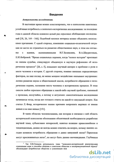 В настоящее время можно констатировать, что в психологии наметилась устойчивая потребность в психолого-исторических исследованиях: за последние годы в данной области появился целый ряд серьезных обобщающих исследований [18, 26, 164 - 166]. Подобный всплеск интереса можно объяснить несколькими причинами. С одной стороны, изменение социально-политической ситуации не могло не отразиться на развитии общественных наук, в этом мы согласны с идеями, высказываемыми И.Г.Белявским, В.А.Шкуратовым, Е.Ю.Бобровой. "Время социальных перемен, когда "колесо истории" проезжает по нашим судьбам, стимулирует обыденную и научную рефлексию об историческом процессе" [26, с. 5], повышает научный интерес к проблеме о роли и месте человека в истории. С другой стороны, помимо внешних определяющих факторов, на наш взгляд, не менее мощное воздействие оказывают внутренние: логика развития науки и общественной мысли, потребности обращения к историческим корням, осознания места человека в историческом процессе. В этом смысле любое серьезное обращение к какой-либо научной проблеме, связанной с прошлым, неслучайно, а потому и актуально: самостоятельное исследование начинается тогда, когда нет готового ответа на какой-то насущный вопрос. Как считал Л. Февр, историческое знание призвано вопрошать мертвых от имени живых и во имя живых [151].